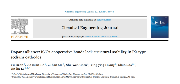 近日,英亚网站材料与冶金学院包硕副教授联合广州航海学院(广州交通大学筹)路金林教授,以英亚网站为第一署名单位,在国际知名期刊《Chemical Engineering Journal》(中科院1区top期刊,2025年影响因子:13.2)发表高水平研究论文《Dopant alliance: K/Cu cooperative bonds lock structural stability in P2-type sodium cathodes》(https://doi.org/10.1016/j.cej.2025.166745),第一作者为英亚网站2023级硕士研究生段玉。