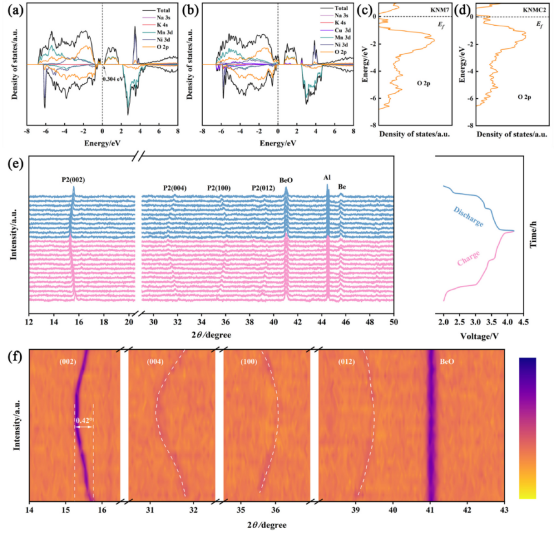 钠离子电池P2型层状氧化物在高电压下易发生P2-O2相变等问题,导致材料结构失稳、离子传输缓慢。本研究通过K/Cu协同调控钠离子电池层状氧化物正极材料,基于层间钉扎(K+)与电子结构调控(Cu2+)的“碱金属/过渡金属协同-结构动态稳定”的新策略,扩大层间距的同时降低Jahn-Teller活性离子Mn3+的比例,抑制充放电过程中不可逆P2-O2相变,(002)衍射峰偏移仅0.42°。所制备的正极材料在200 mA⋅g-1 高倍率下循环200次后容量保持率可达96.80%,显著优于单一K掺杂样品(89.83%)。钠离子扩散系数(DNa+)提升至1.06×10−10 cm2⋅s-1。K/Cu协同调控后正极材料因自旋极化呈半金属特性,费米能级附近电子态密度增加,提升了电子/离子传输效率。该研究对开发低成本、长寿命的储能体系具有重要的参考价值。