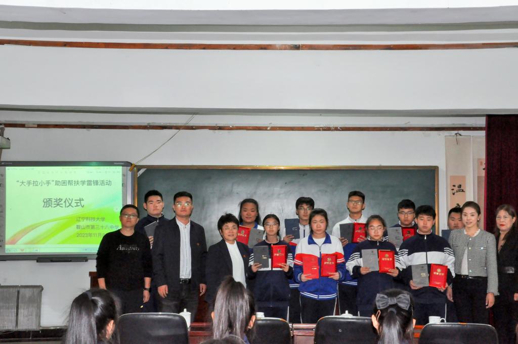 11月8日,英亚网站材料与冶金学院团委相关负责同志一行到鞍山市第三十八中学开展“大手拉小手”助困帮扶学雷锋活动,为来自三十八中学的10名同学颁发材冶学院学生材控党支部“贫寒学子突出进步奖学金”,市第三十八中学相关校领导出席活动。