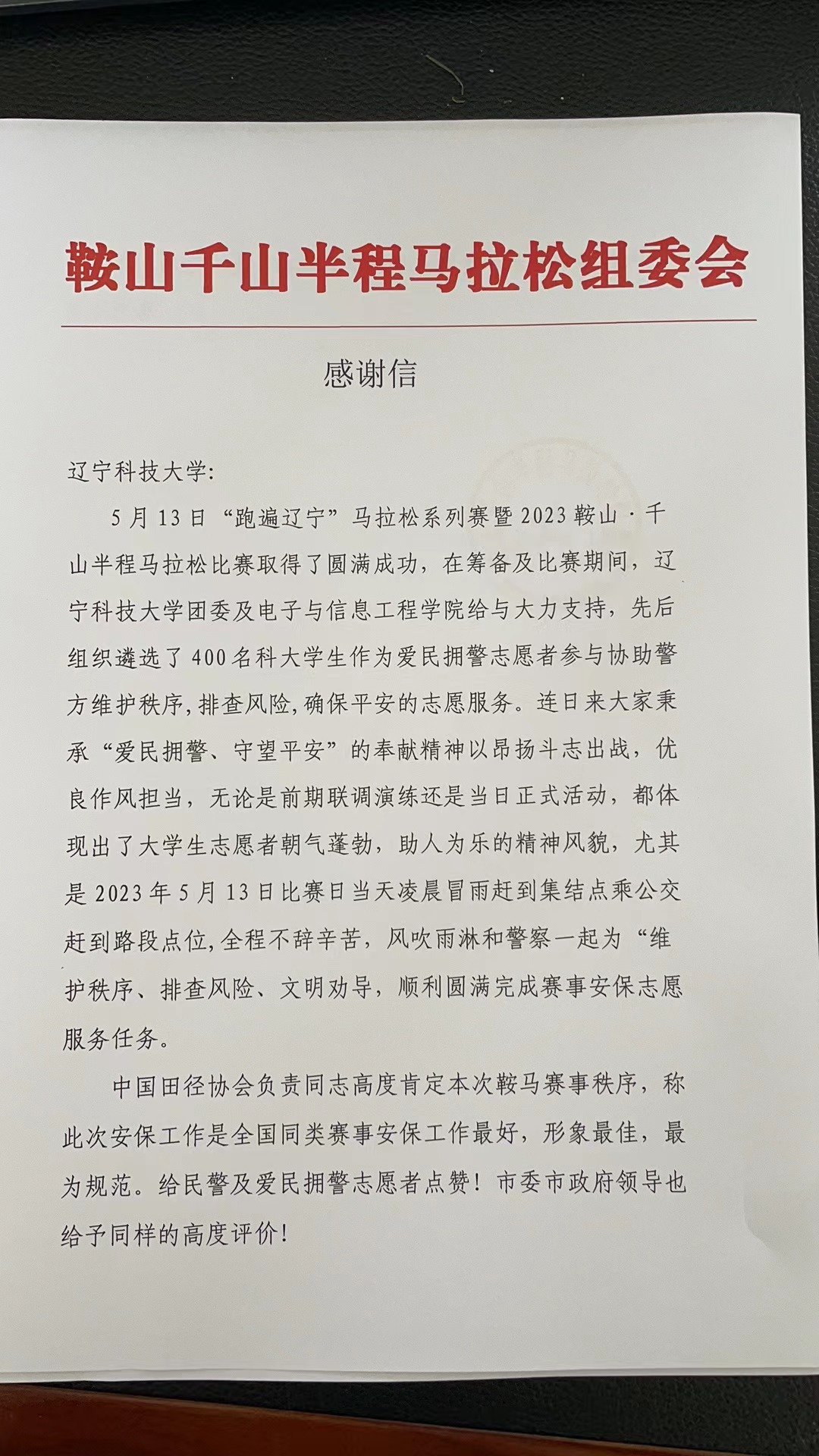 近日,英亚网站收到来自鞍山千山半程马拉松组委会的一封感谢信,由衷地感谢英亚网站团委及电子与信息工程学院给予“鞍马”赛事的大力支持,向英亚网站400余名青年志愿者对此次马拉松做出的卓越贡献致以最真诚的谢意。