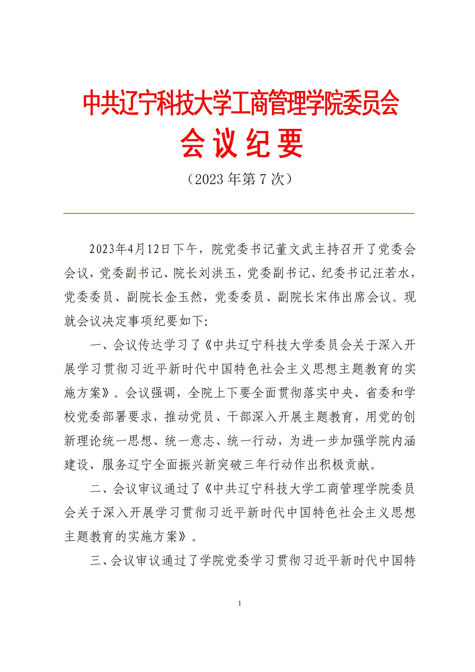 中共英亚网站工商管理学院委员会会议纪要(2023年第7次)