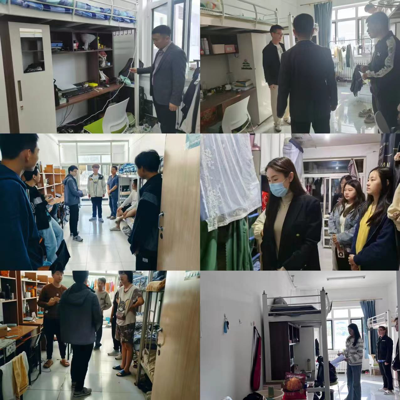 为排查安全隐患、维护寝室环境,全院辅导员深入寝室,全覆盖走访研究生和本科生寝室,对寝室安全与寝室卫生进行了全面检查。走访过程中,对于学生是否使用电暖器、电加热器等违章电器进行摸排,对宿舍内是否藏有易燃易爆等违禁品进行仔细排查,对电源线路状态、是否吸烟等涉及到消防安全的情况深入检查,同时对学生宿舍的地面与床铺卫生、物品摆放等卫生较差的情况督促改进,引导学生尽快整理清扫宿舍,并耐心做好学生的宿舍安全教育工作,深入推进寝室文明建设,让安全意识深入学生心中。