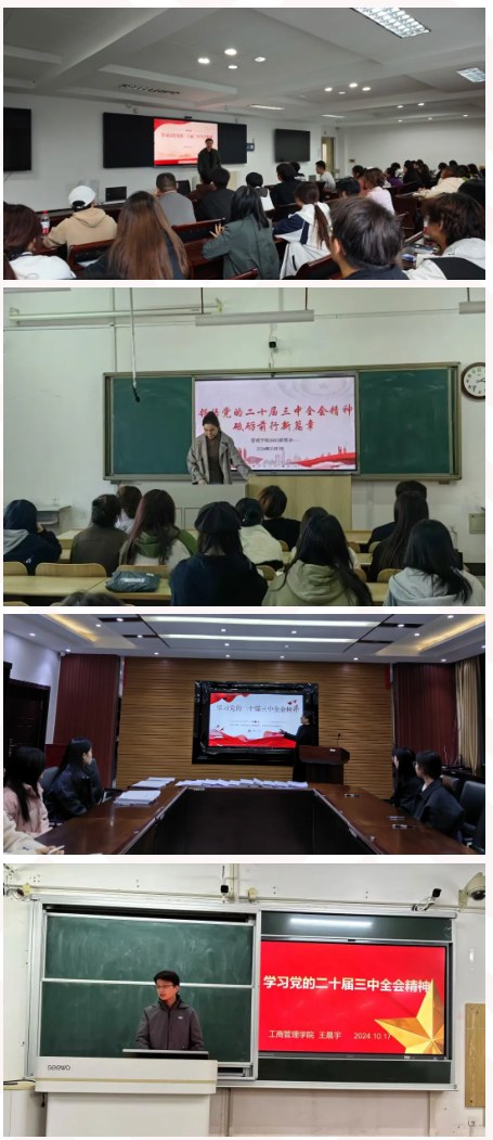 辅导员向同学们深入传达了党的二十届三中全会的重要精神,紧密结合学院的专业特色和同学们的学习生活实际,对会议精神进行了深入浅出的解读,引导同学们将思想和行动统一到学习贯彻党的二十届三中全会精神上来。