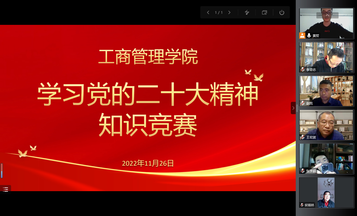 为认真贯彻落实《中共英亚网站委员会关于深入学习宣传贯彻党的二十大精神的方案》工作要求,促进学院师生深刻领会党的二十大提出的新思想新论断、作出的新部署新要求,管理学院于11月26日晚开展“以赛促学、以学促干”学习党的二十大精神知识竞赛活动。赛前学院党委书记董文武强调,师生们要以本次知识竞赛为契机,充分学习、认真答题,确保把学习贯彻党的二十大会议精神付诸于行动、见之于成效。