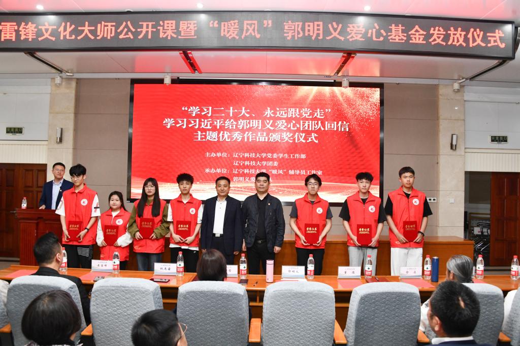 会上,首先播放了社会爱心人士的祝福视频,进行了“学习二十大 永远跟党走”深入学习习近平总书记给郭明义爱心团队回信精神为主题内容的来自全国各地著名书法家、爱心团队以及学生们的书法作品及征文展示并进行颁奖。随后,举行了“暖风”郭明义爱心基金捐赠仪式。今年,“暖风”郭明义爱心团队将爱心基金由去年的4万元增加到6万元,资助了60名学校贫困学生,以此纪念毛泽东等老一辈革命家为雷锋同志题词60周年。“暖风”爱心基金凝聚了 “暖风人”的关心和关爱,也在全体学生的心中种下了一颗爱的种子,相信这颗种子在阳光的照耀和雨水的滋润下,一定会生根、发芽,成长为一棵能为他人庇荫的参天大树。