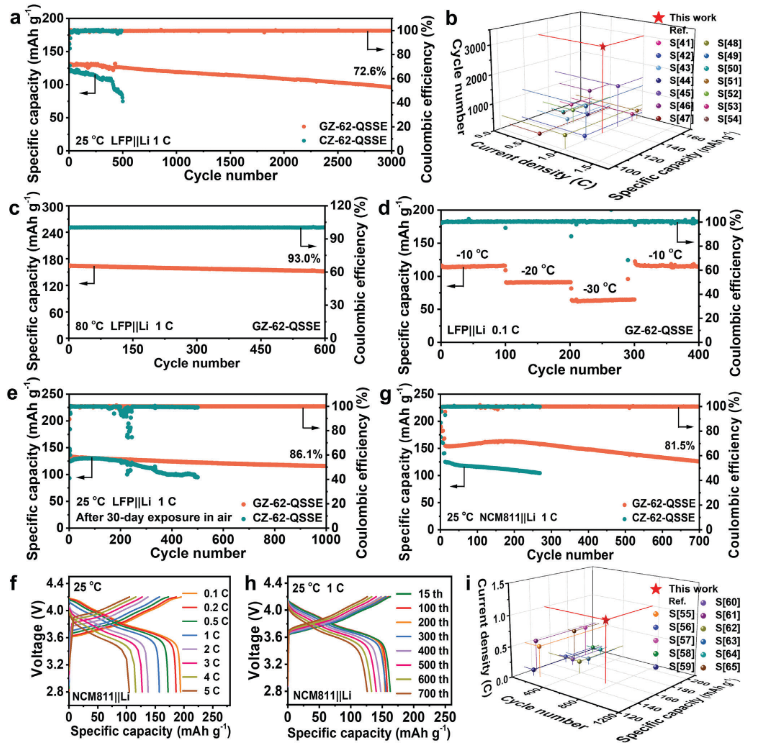 该研究以玻璃态ZIF-62为研究对象,通过理论模拟与实验验证,首次揭示了玻璃态金属有机框架(MOF)材料中锂离子的分子级传导机制,并开发出高性能固态电解质,显著提升了锂金属电池的循环寿命与快速充放电能力,为下一代高安全、高能量密度电池技术提供了全新解决方案。研究所开发的GZ-62-QSSE兼具高安全性(阻燃、抗枝晶)与工业化潜力(空气稳定性好、制备工艺成熟),可广泛应用于电动汽车、储能系统及便携电子设备领域,助力我国新能源产业技术升级。