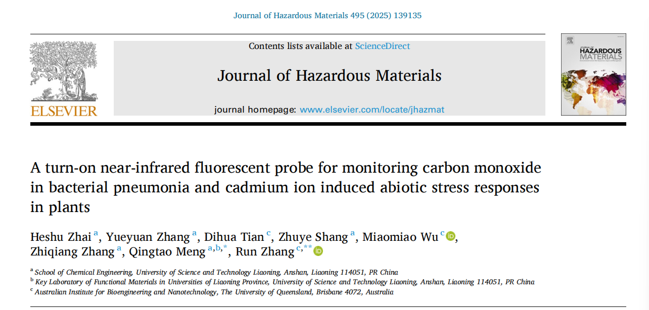 近日,英亚网站化学工程学院在新型近红外荧光探针用于同步追踪一氧化碳(CO)在动物炎症(细菌性肺炎)和植物重金属胁迫(镉毒害)过程中的动态行为取得重要进展,突破性实现单探针跨物种应用。研究成果以《A turn-on near-infrared fluorescent probe for monitoring carbon monoxide in bacterial pneumonia and cadmium ion induced abiotic stress responses in plants》为题发表于环境科学与生态学领域国际顶级期刊《Journal of Hazardous Materials》(中科院一区TOP期刊,IF=11.3)。论文第一作者为化学工程学院博士研究生翟鹤书,通讯作者为化学工程学院孟庆涛教授。