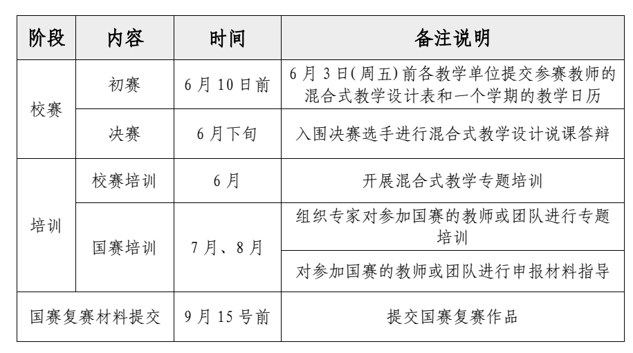 决赛:入围现场说课答辩环节的教师需准备一次混合式教学设计的说课PPT,并参加说课答辩,汇报内容和形式请参考说课指南(附件4),说课答辩的时间另行通知。