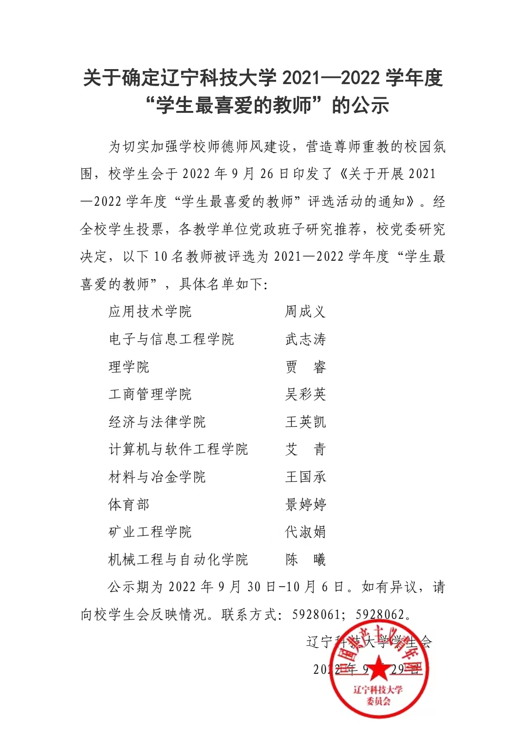 关于确定英亚网站 2021—2022 学年度 “学生最喜爱的教师”的公示