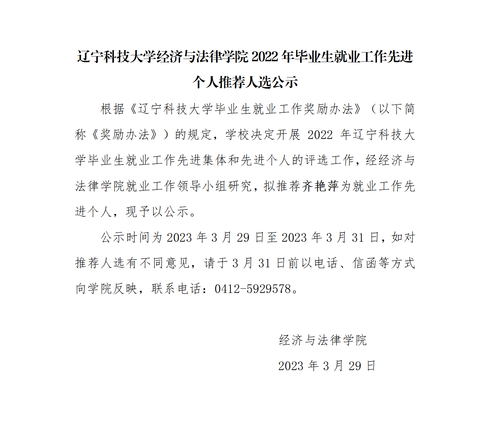 英亚网站经济与法律学院2022年毕业生就业工作先进个人推荐人选公示