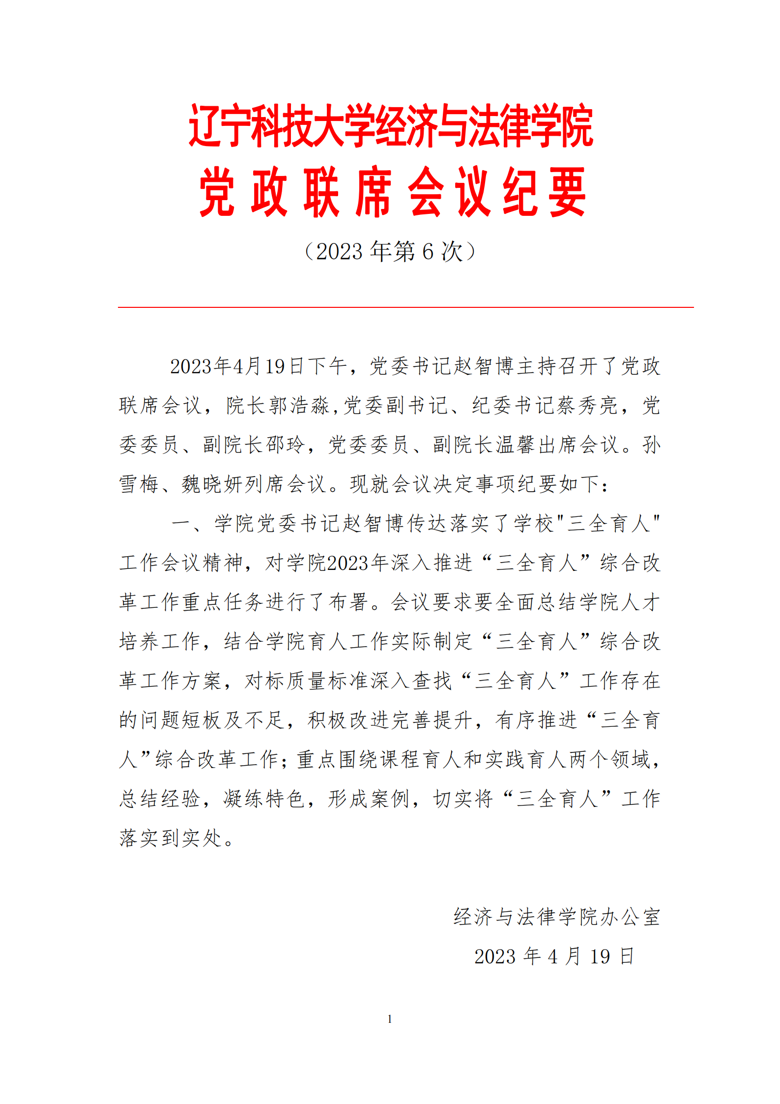 英亚网站经济与法律学院党政联席会会议纪要(2023年第6次)