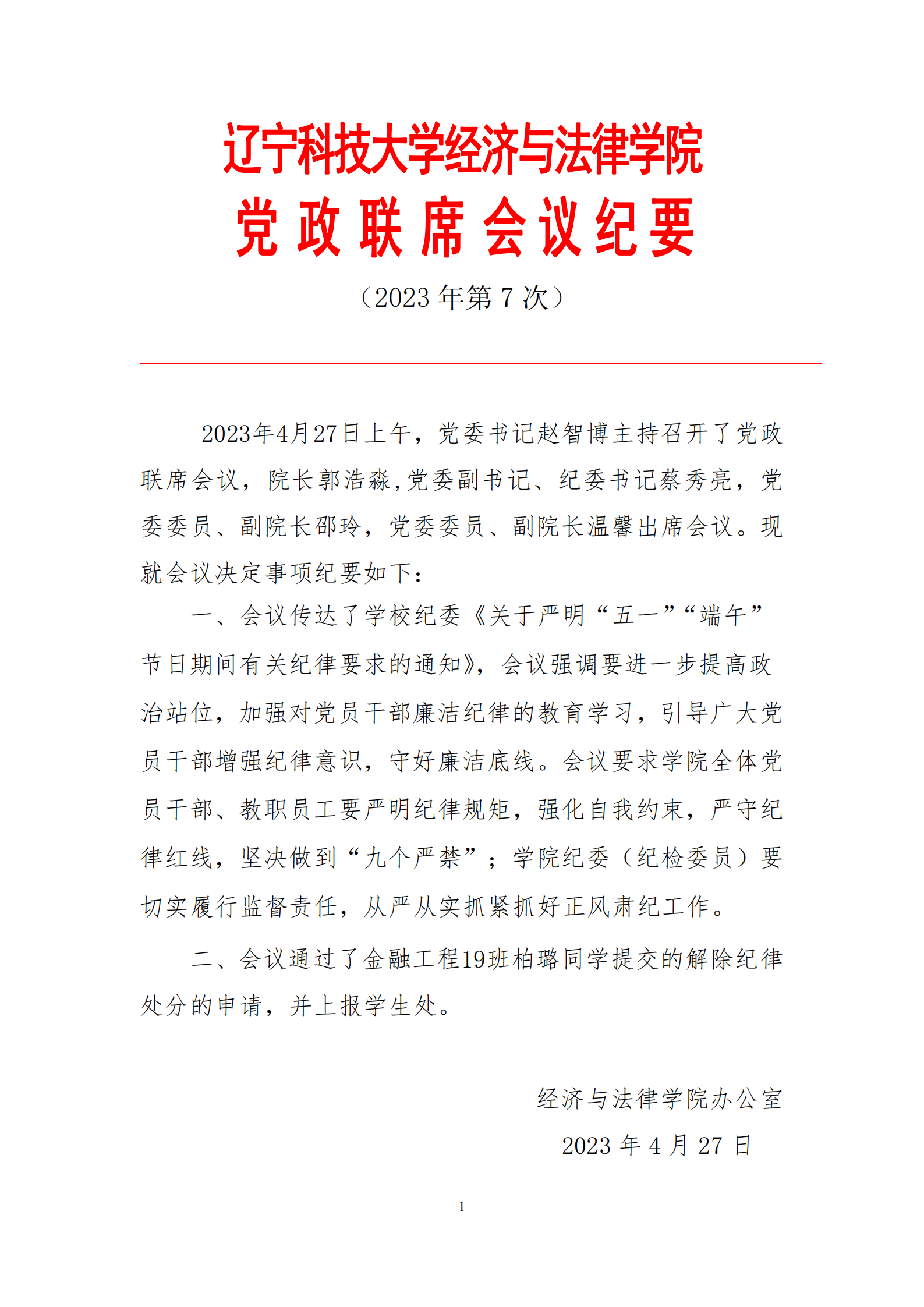 英亚网站经济与法律学院党政联席会会议纪要(2023年第7次)
