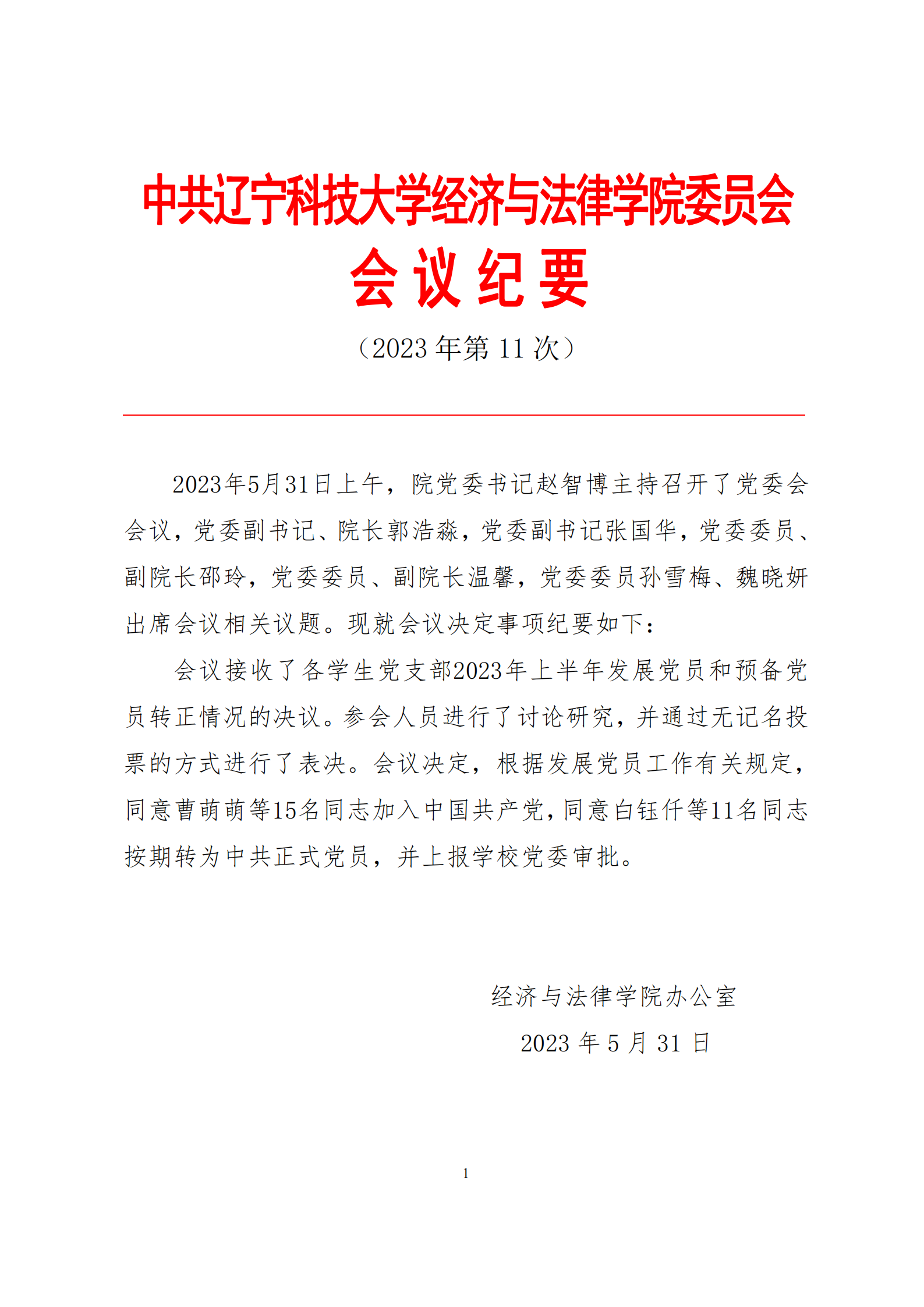 中共英亚网站经济与法律学院委员会会议纪要(2023年第11次)