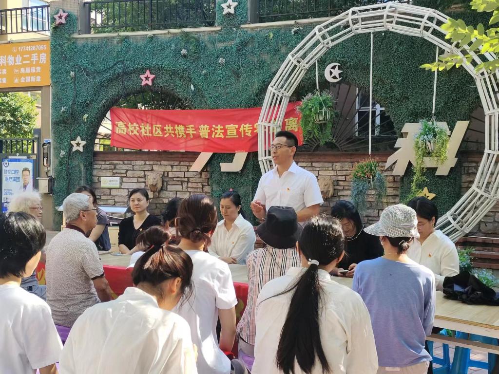 活动伊始,赵智博首先向社区居民介绍了来自经法学院的“普法宣讲团”成员,并表示希望本次普法活动能够帮助居民更好地维护自身权利,促进社区的安定团结与和谐发展。活动中,法学专业教师房娇娇有针对性地对《中华人民共和国民法典》中婚姻法赋予公民的基本权利以及婚姻家庭编新规进行了讲解。她从居民最关心、最常见的问题出发,采取以案说法、以案学法的方式,用通俗易懂的语言对婚姻家庭纠纷、离婚冷静期、离婚经济补偿制度等居民婚姻家庭领域常见法律问题进行了细致的讲解,引导社区居民树立正确的婚姻家庭观念,通过合法途径解决婚姻家庭矛盾纠纷。为配合“6.26”国际禁毒日宣传,经法学院法律协会会长、法学22-2班石悦涵作主题为“习近平法治思想与禁毒宣传”的普法宣讲。她首先向居民普及了习近平法治思想以及习近平总书记围绕全面依法治国所作出的重要论述,并讲解了如何在日常生活中践行习近平法治思想。随后,她依据《中华人民共和国刑法》和《中华人民共和国禁毒法》的相关规定,向居民介绍了毒品的概念、特征、危害及防范毒品的措施等内容。她强调,毒品问题不仅关系到个人和家庭的幸福,更关系到社会的和谐与稳定,习近平法治思想提供了全面依法治国的科学指引,也为禁毒宣传工作提供了坚实的理论基础和实践指导,希望大家能够深入学习贯彻习近平法治思想,增强法治意识,共同推动社区法治建设。活动中,一位电信诈骗受害居民主动“现身说法”,向大家分享了自己被电信诈骗的真实经历,提醒大家在日常生活中要时刻提高警惕,关注诈骗案例,了解诈骗手段,遇到问题及时向公安机关寻求法律帮助。她的讲述让听众身临其境,切实体会到了诈骗分子的狡猾和普法的重要性。居民们纷纷表示,提升反诈骗意识和法律意识太有必要了,一定会牢记宝贵的防骗知识和法律求助办法,维护好自身和他人的合法权益。最后,经法学院法学专业教师及“普法小助理”们解答了社区居民在实际生活中遇到的法律疑惑,进一步帮助居民运用法律武器维护自身合法权益。