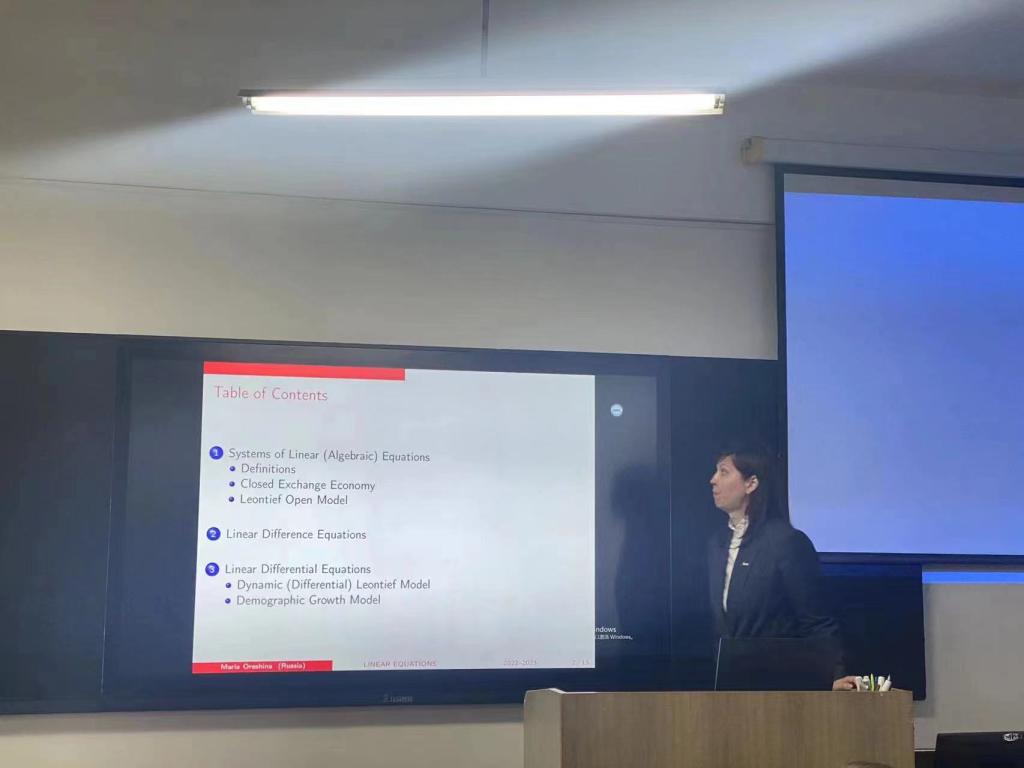 交流中,英亚网站经法学院院长郭浩淼介绍了经法学院国际经济与贸易、金融和金融科技三个专业的发展现状、主要研究方向及近几年取得的主要研究成果。Галкин Александр Васильевич院长向经法学院师生介绍了俄罗斯利佩茨克州、利佩茨克国立技术大学的基本情况及如何运用EPR软件的核心算法来优化管理生产计划;Сысоев Антон Сергеевич副院长讲授了如何运用应用线性回归模型来描述社会经济系统的动态问题;Орешина Мария Николаевна主任介绍了代数方程组、微分和差分模型在经济分析中的应用。与会的经法学院师生与三位俄方教师就相互关心的学术问题进行了深入的交流互动。