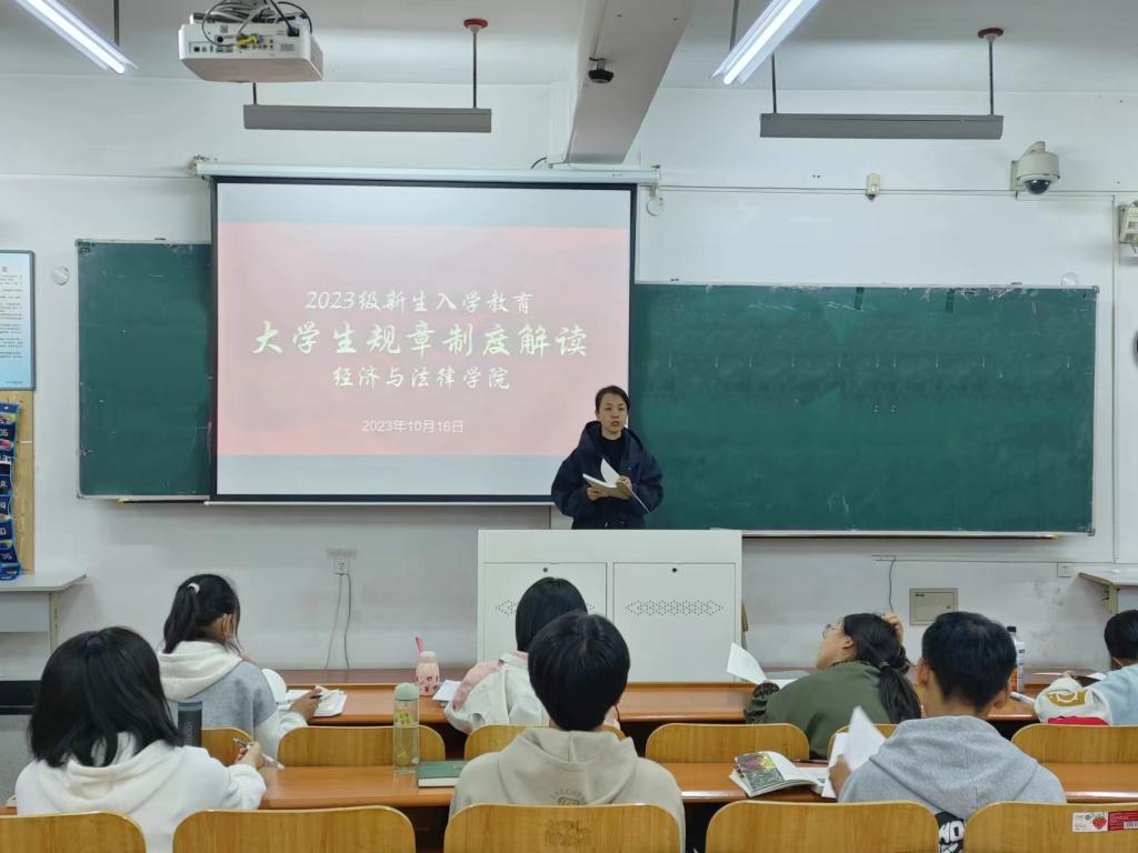 为了让2023级新生充分了解学校规章制度,帮助他们更好地规范自身行为,养成良好习惯,确立学习目标,10月16日,经法学院于博学楼C306、C310分别召开新生入学教育之"大学生规章制度"解读会,主讲人为学办主任齐艳萍,2023级全体新生参加会议。