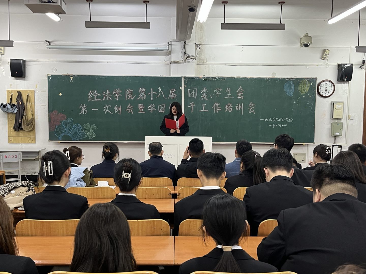 10月23日下午,经法学院第十八届团委、学生会第一次例会暨学团骨干工作培训会在博学楼C112举行。学院党委书记赵智博、党委副书记张国华、团委副书记张鹏飞出席会议,经法学院学生会全体学团骨干参加了本次会议。会议由经法学院第十八届学生会执行主席兼办公室负责人吴雨纯主持。