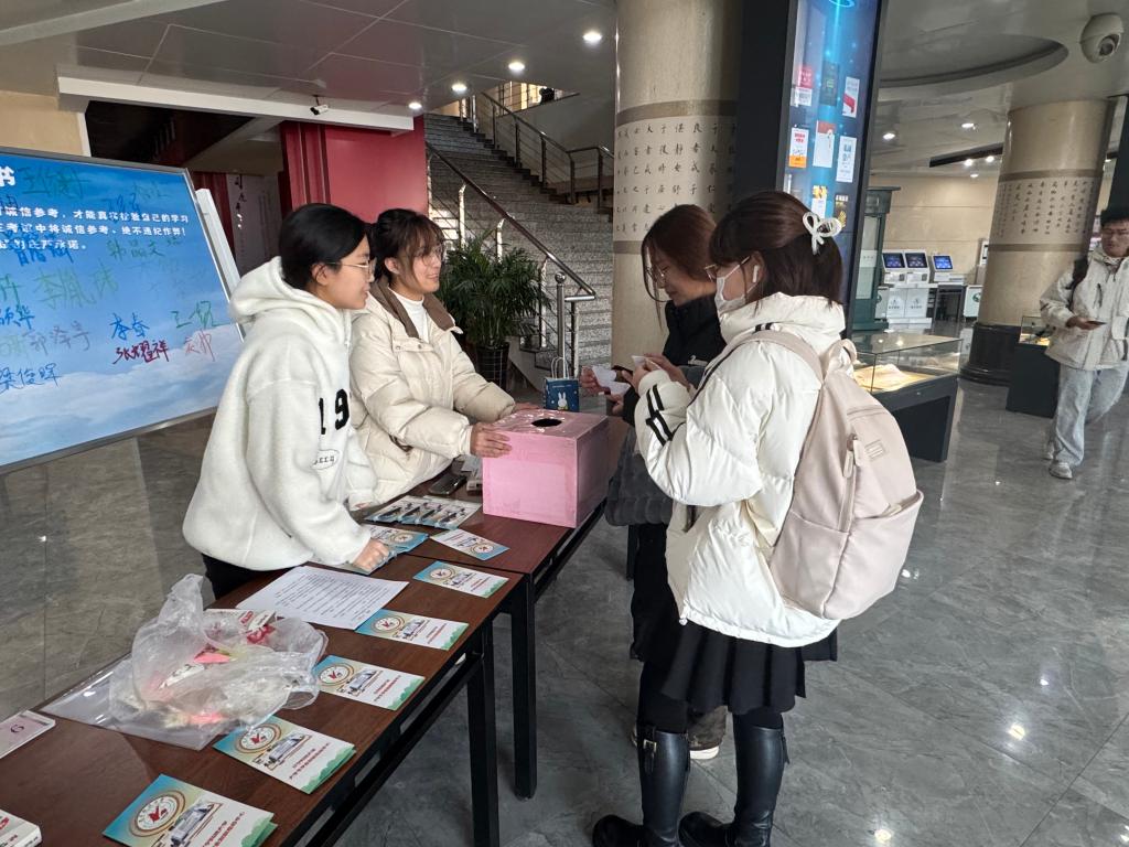 12月24日至12月25日,由教务处大学生学业发展指导中心主办、学生学业发展委员会承办的“诚信考试,学途坦行”主题活动于图书馆二楼大厅举行,活动吸引了1000余人参与。活动旨在通过趣味多元的形式,向同学们深入传递诚信考试的重要理念,助力营造良好的校园考试风气。