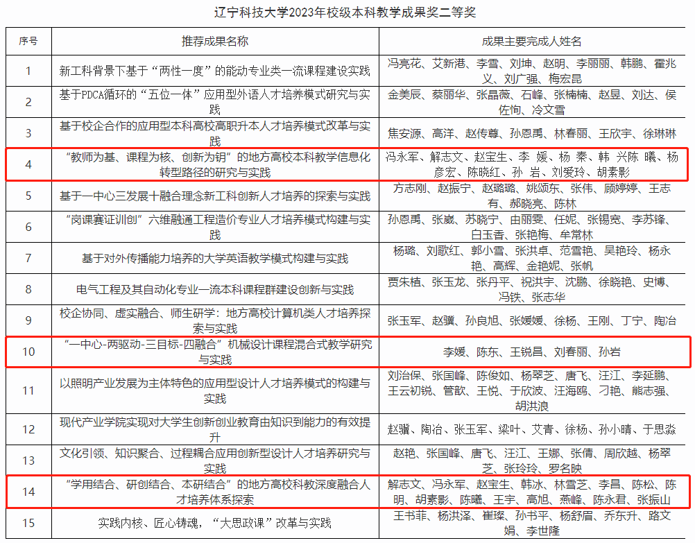 7月13日,英亚网站发布了关于2023年校级本科教学成果奖的获奖通知,此次评审根据《关于开展2023年校级本科教学成果奖评选工作的通知》(英亚网站教发〔2023〕70号)相关安排,经成果建设团队申报、学院推荐,学校组织专家综合评审,评选出2023年校级本科教学成果奖共42项,包括一等奖10项,二等奖15项,三等奖17项,我院有4个教学团队获奖。其中王立萍老师负责的团队荣获一等奖,冯永军、李媛、解志文老师负责的团队荣获二等奖。