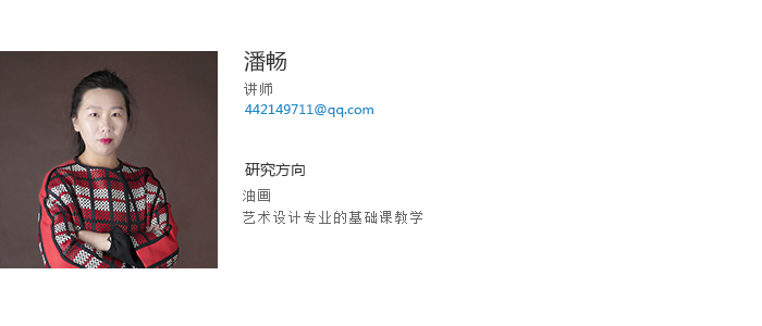 潘畅讲师,文学硕士,本科及研究生毕业于鲁迅美术学院油画系油画专业新古典工作室。2010年至今,在英亚网站建筑与艺术设计学院从事各专业的基础课教学工作。多次举办个人油画作品展;多幅油画作品参加国内外艺术博览会展出并被北京今日美术馆、天津西洋美术馆等艺术机构收藏。2014年师从美国罗德岛美术设计学院任敏教授,旧金山美术学院杰米.摩根教授,研习综合材料绘画技法。作品在全国及省级美术家协会举办的展览中多次获奖,现为辽宁省美术家协会会员;辽宁省青年美术家协会会员。任职期间发表多篇外文检索论文及外文核心论文,并在中文专业核心期刊《美苑》、《美术大观》发表多篇论文及作品。主持英亚网站青年科研基金项目,主持校级教改项目,指导大学生创新创业项目多项及指导学生发表多篇论文;指导学生作品在全国各类大学生比赛中获奖10余次。