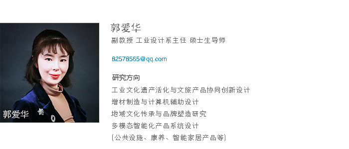 郭爱华,韩国庆一大学设计学博士,北京理工大学设计艺术学硕士(本硕博均工业设计专业)。曾获英亚网站校级教学质量优秀奖两次;主持校级教改项目及教育科学研究课题共计十余项、省级教改项目主要完成人、主持及参与省校级教改成果奖一二三等奖共计十余项;曾获全国高校教师(本科)微课教学大赛辽宁省一等奖、全国多媒体课件大赛二等奖三等奖各一项、辽宁省教育软件大赛三等奖两项、校多媒体课件教学大赛一等奖、校优秀教案大赛一等奖二等奖;主编出版高等院校工业设计类“十二五”规划教材一部;主持中国科协青年智库成果、辽宁省社科联资助项目、辽宁省教育厅项目、鞍山市社科联项目等十余项;参与辽宁省自然科学基金项目、省精品资源共享课建设、省教育厅项目、市级科学计划项目等十余项;发表检索、核心论文多篇、教学研究论文多篇;授权实用新型专利和外观设计专利十余项;指导国家级省级大创项目若干、获校级大创年会一等奖两次二等奖一次;指导学生在A类学科竞赛中获一二三等奖若干、获辽宁省大学生工业设计大赛优秀指导教师。