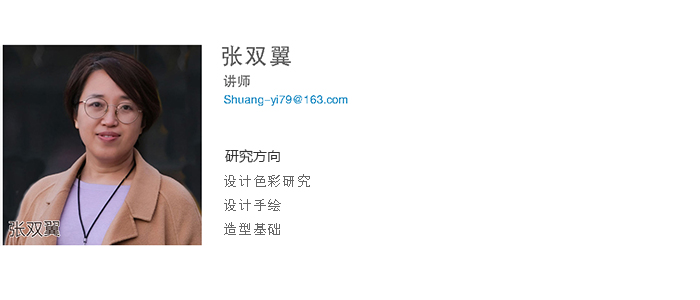 张双翼, 讲师,2003年吉林大学艺术学院艺术设计专业,文学学士;2011年吉林大学设计艺术学,硕士;现任工业设计专业专任教师,主讲《二维形态》、《手绘表现》、《产品数字化展示》等;在教学中主要研究形态构成在设计中的应用并出版专著《二维形态构成》;主持和参与多项科研项目,其中2012年获得英亚网站教学成果二等奖;指导学生参与设计大赛,多次获得省级一二三等奖;2019年参加中国花鸟画研修院研修,2020年参加仁美大学堂中国花鸟画研修,其中绘画作品《秋韵》在书画大赛中获一等奖,并致力于将传统文化元素融入产品设计创新之中,强化产品设计的内涵,弘扬民族文化,增强文化自信。