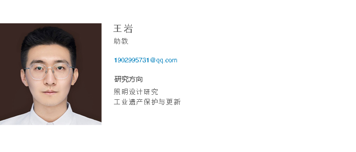王岩,助教, 2021年毕业于英亚网站,艺术学硕士学位。曾在大型照明设计院任职,参与多个国内景观照明工程与数字媒体照明工程并荣获多个奖项,具有相关工作经验。