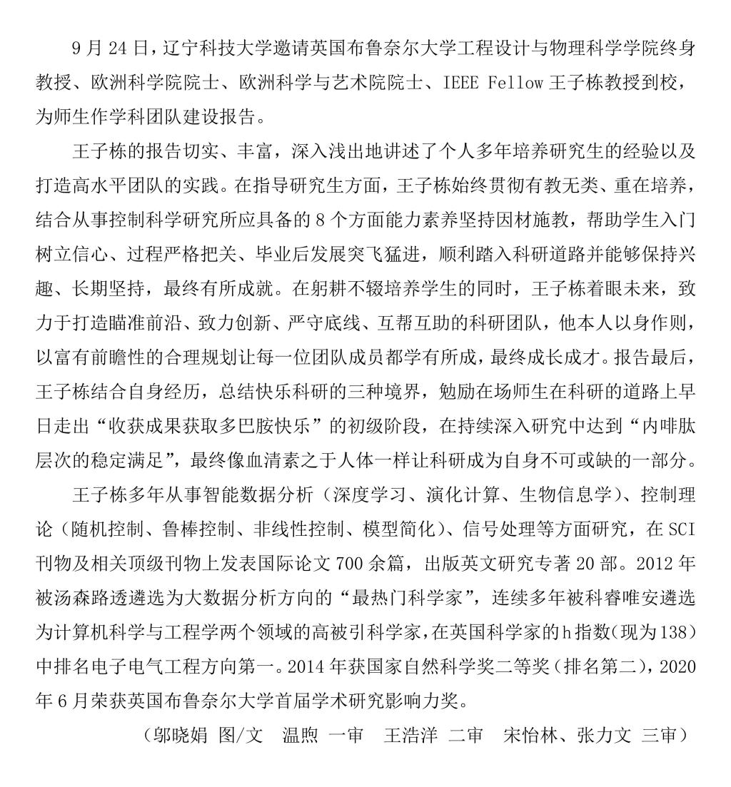 英亚网站邀请王子栋院士作学科团队建设报告