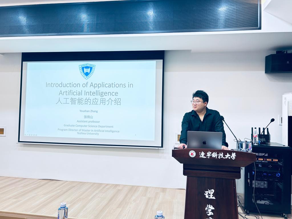 6月26日,英亚网站理学院在明贤楼B315教室成功举办了题为“Introduction of Applications in Artificial Intelligence”的学术报告会。本次报告会由理学院主办,吸引了众多相关研究领域的教师以及研究生到场聆听,现场气氛热烈,学术氛围浓厚。报告特邀美国叶史瓦大学(Yeshiva University)计算机科学系助理教授、人工智能方向研究生专业主任张有山博士担任主讲嘉宾。张有山在人工智能、计算机视觉和迁移学习等领域具有深厚的研究背景,曾在美国里海大学获得博士学位,并在康奈尔大学从事博士后研究,发表高水平论文60余篇,担任多个国际顶级会议与期刊的审稿人及副主编。