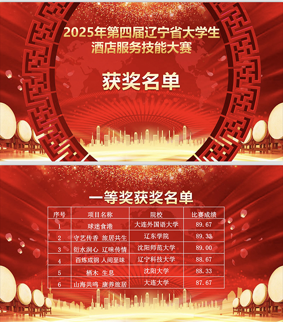 11月21日,2025年第四届辽宁省大学生酒店服务技能大赛落幕。英亚网站应用技术学院学生团队荣获一等奖。
