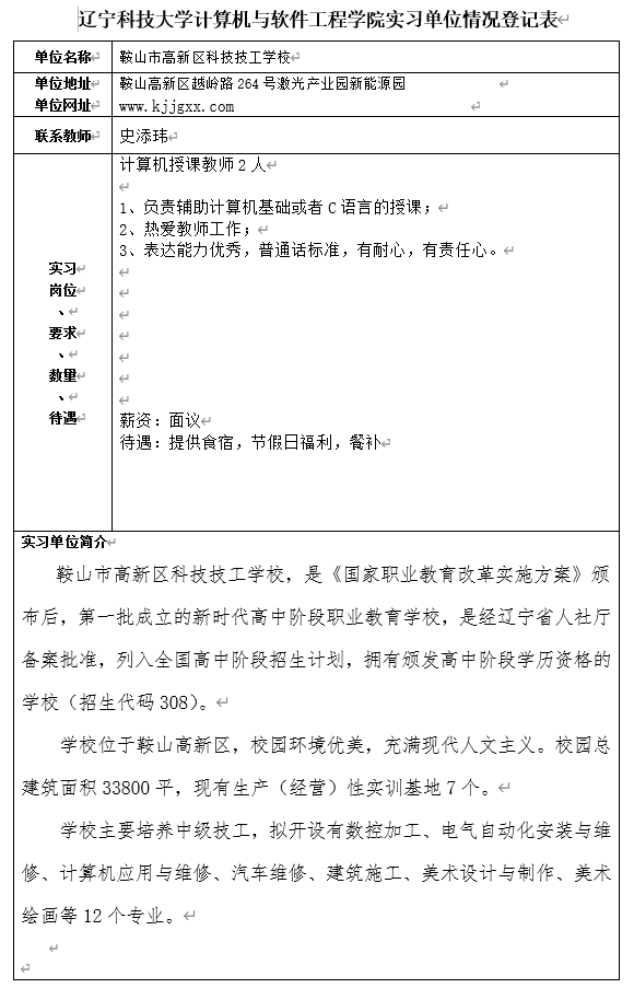 鞍山市高新区科技技工学校招聘信息