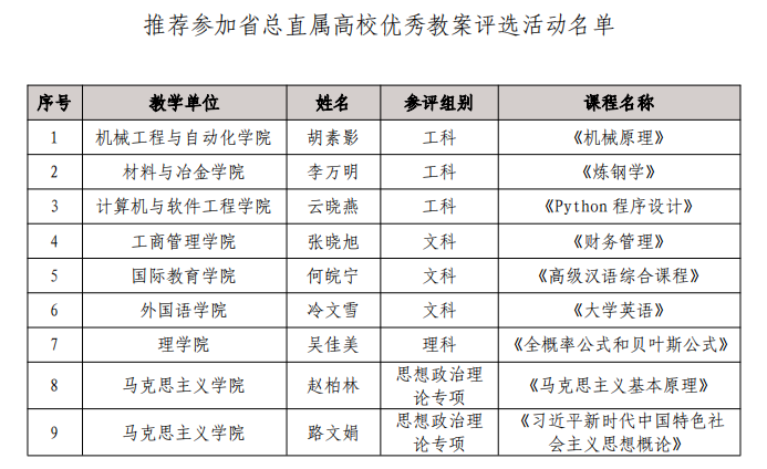 推荐参加省总直属高校优秀教案评选活动1项。