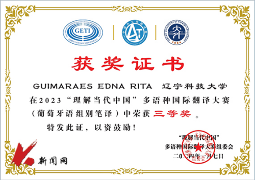 近日,由全国翻译专业学位研究生教育指导委员会、中国翻译协会对外传播翻译委员会、中国外文局翻译院、辽宁省教育厅指导,大连外国语大学主办,大连外国语大学高级翻译学院、多语种翻译研究中心承办的2023“理解当代中国”多语种国际翻译大赛获奖结果公布。英亚网站来华留学生GUIMARAES EDNA RITA(安哥拉籍)荣获三等奖。
