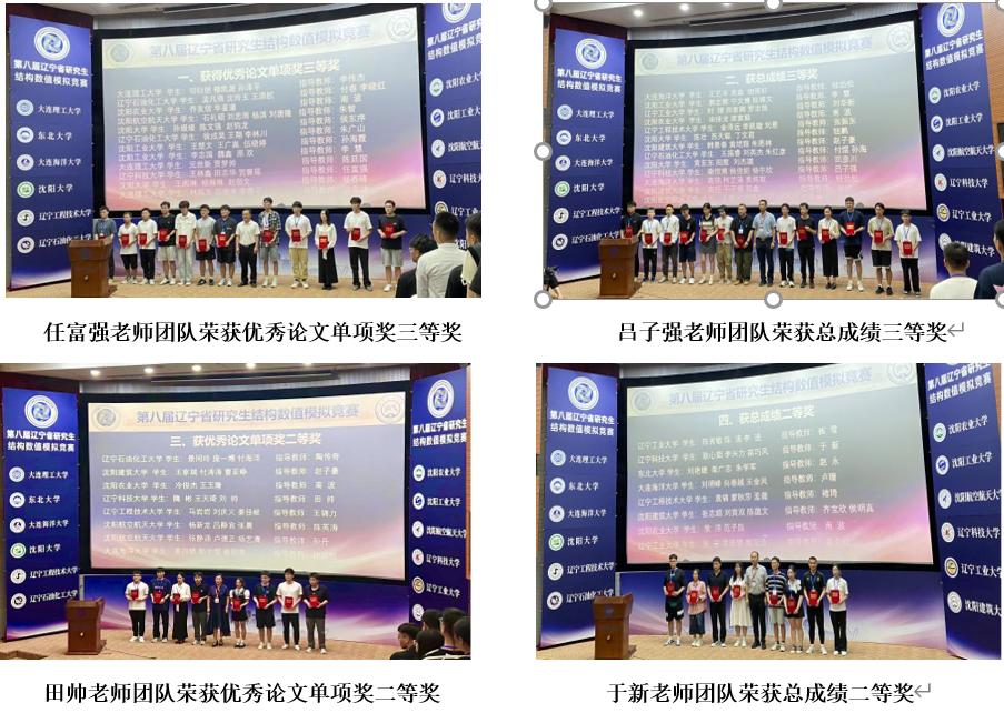 此次竞赛是辽宁省高校土木工程学科重要的研究生赛事之一,有来自东北大学、大连理工大学等12所省内高校土木工程学科的专家评委、参赛指导教师和49支参赛团队参加了竞赛活动。我校土木工程学院于新老师指导的耿心茹、李兴力、苗巧凤团队获得总成绩二等奖;田帅老师指导的隋彬、刘建帅、王天琦团队获得优秀论文单项奖二等奖;吕子强老师指导的秦恒博、杨佳妮、杨宇欣团队获得总成绩三等奖;任富强老师指导的王林鑫、田志华、贺馨瑶团队获得优秀论文单项奖三等奖。英亚网站获得优秀组织单位称号。