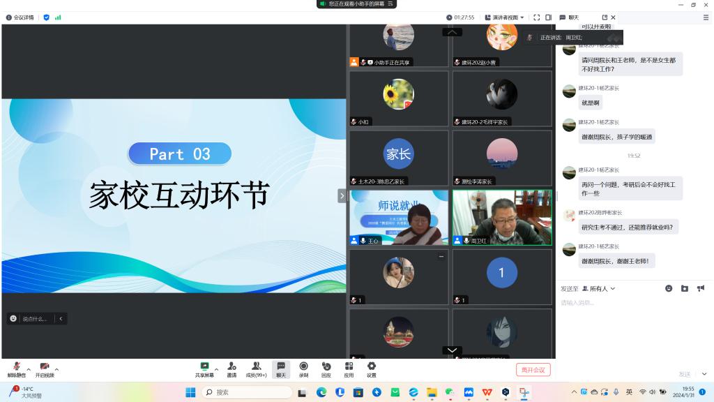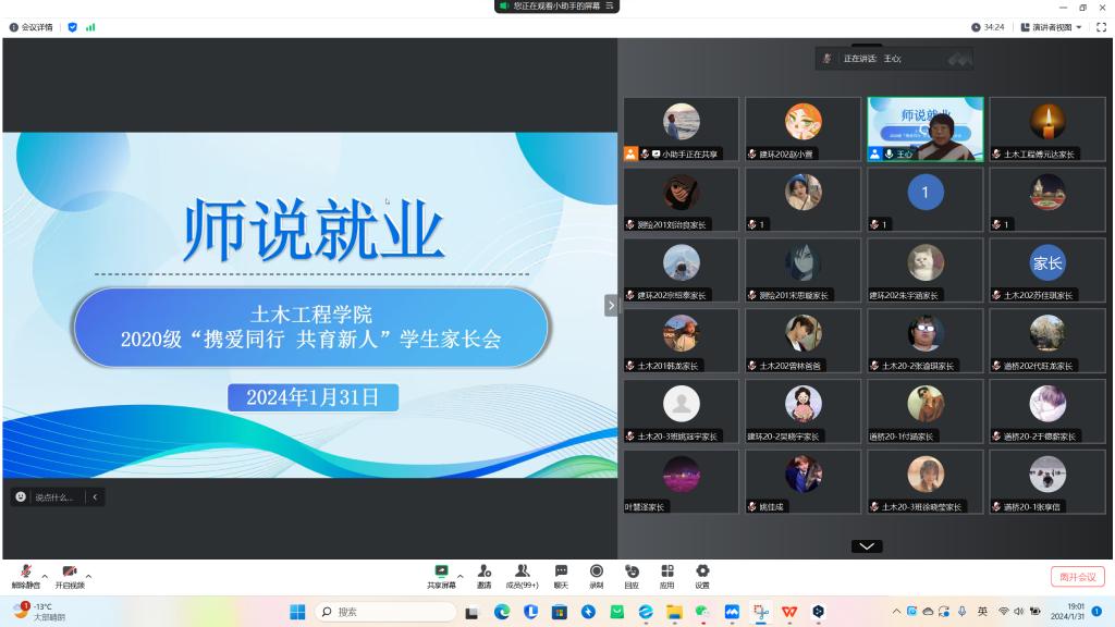2月1日,英亚网站土木工程学院“家校共育,共促就业”家长会于线上召开,学院院长周卫红教授应邀出席并围绕职业生涯规划和就业指导等内容展开宣讲,2024届毕业班辅导员、全体毕业生及家长参加会议。