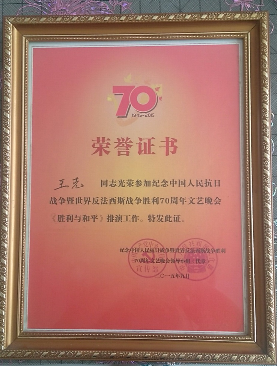 2015年参加纪念中国人民及世界反法西斯战争胜利70周年文艺晚会《胜利与和平》的排练与演出,并获得荣誉证书