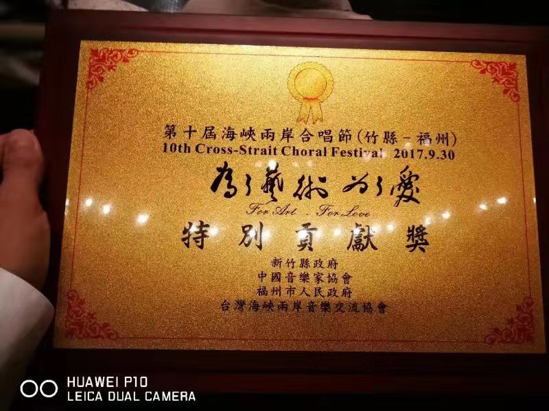 2017年赴台湾参加了第十届海峡两岸合唱节“为了艺术,为了爱”,获得“特别贡献奖”荣誉证书