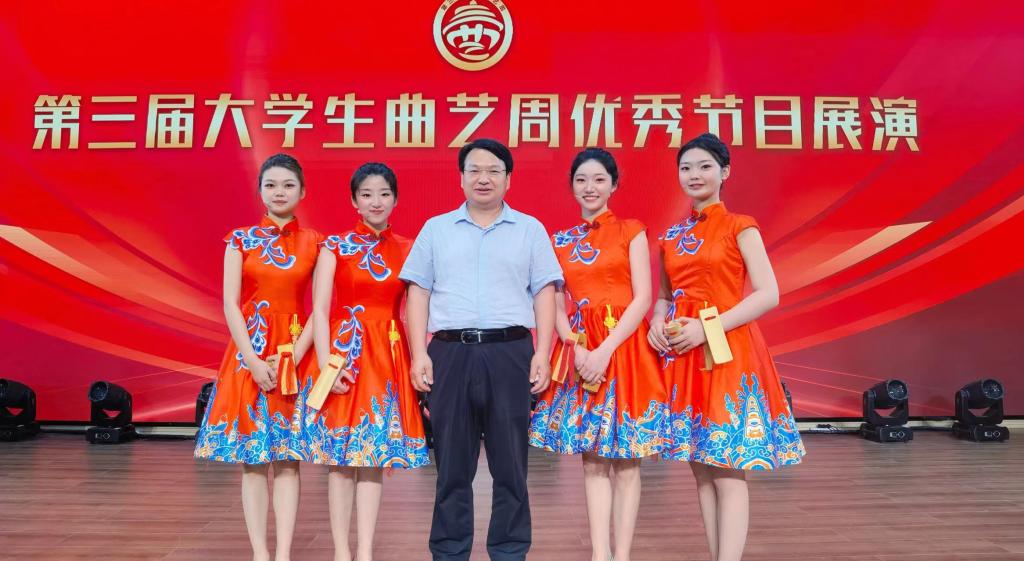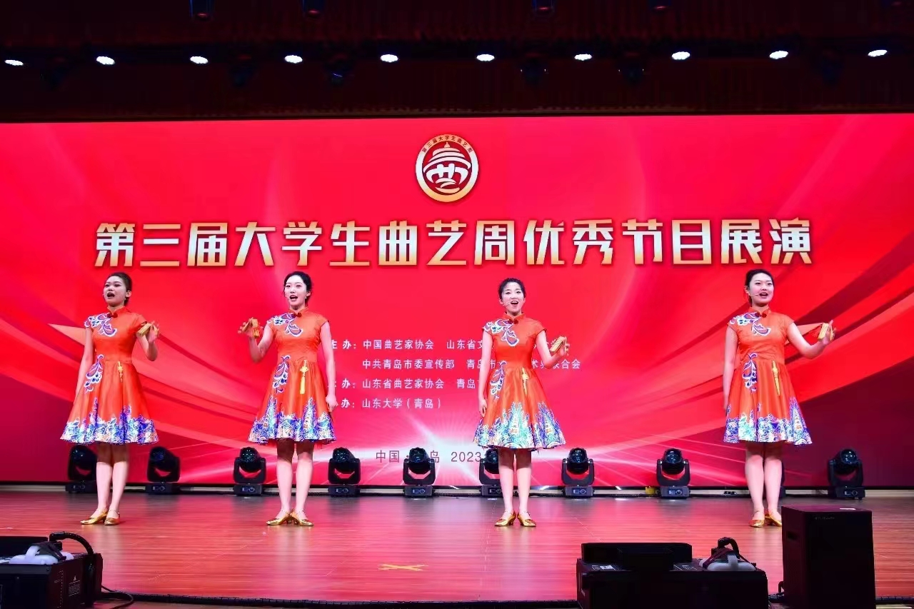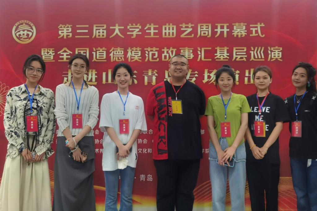 5月19日-21日,第三届大学生曲艺周在青岛举行。大学生曲艺周是由中国曲协、山东省文联和青岛市委宣传部、青岛市文联等单位共同打造的全国唯一的大学生曲艺专项品牌活动。本次活动由山东省曲协、青岛市曲协、中共李沧区委宣传部承办。英亚网站艺术学院选送作品群口快板《中国诗民族魂》、相声《女神养成记》入选展演,师生7人赴青岛参加曲艺周。